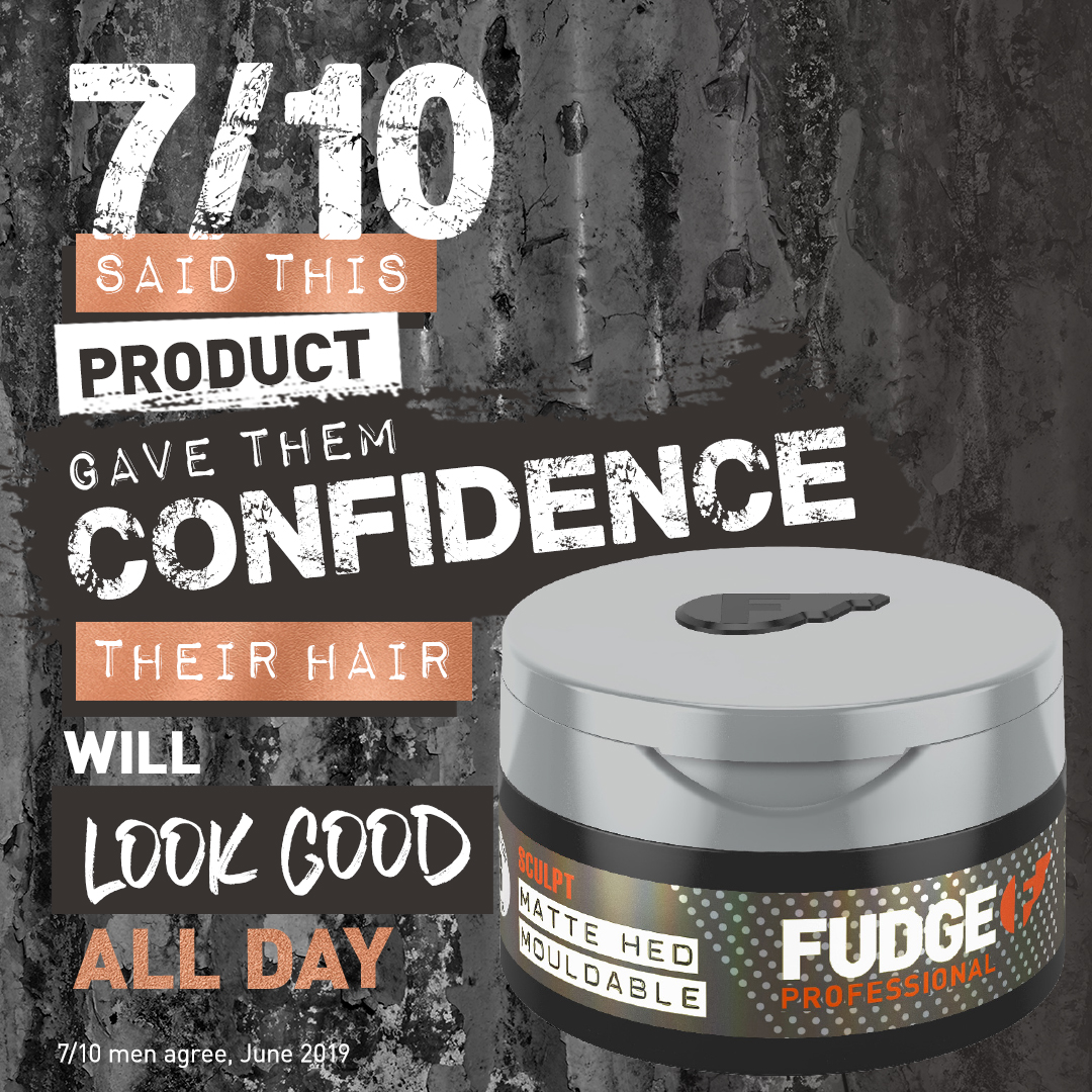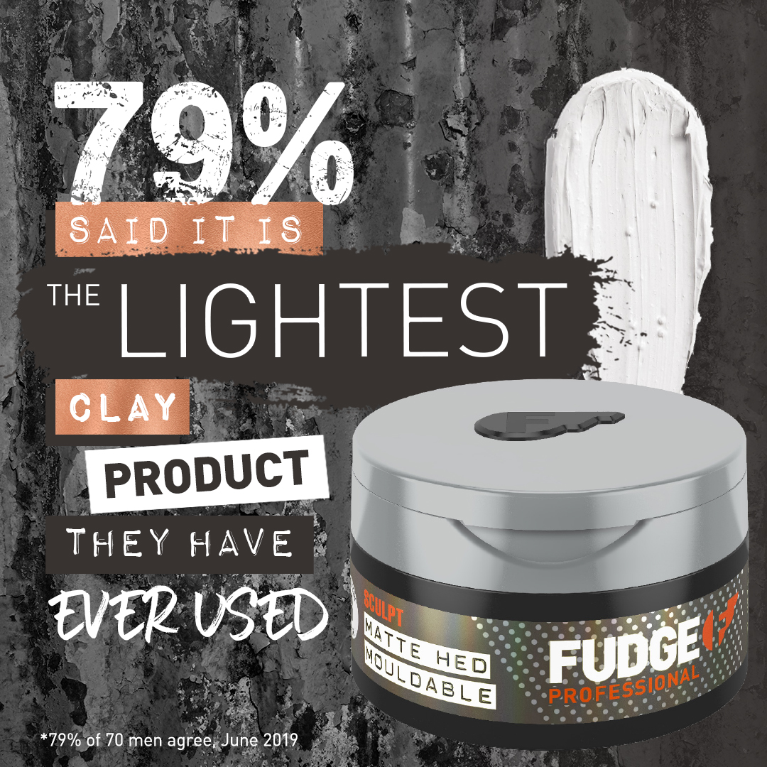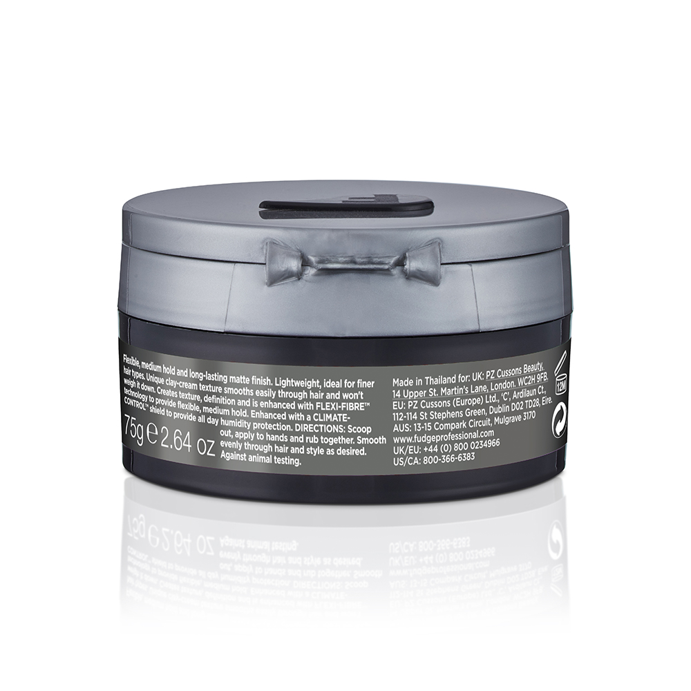 Fudge Professional Matte Hed Mouldable. Flexible, medium hold and long-lasting matte finish hair styling creme. This lightweight hair creme is ideal for fine hair types. The unique clay-cream texture smooths easily through hair and won’t weigh it down. It creates texture, definition and is enhanced with FLEXI-FIBRE technology to provide flexible, medium hold. Enhanced with a CLIMATE-CONTROL shield to provide all day humidity protection.